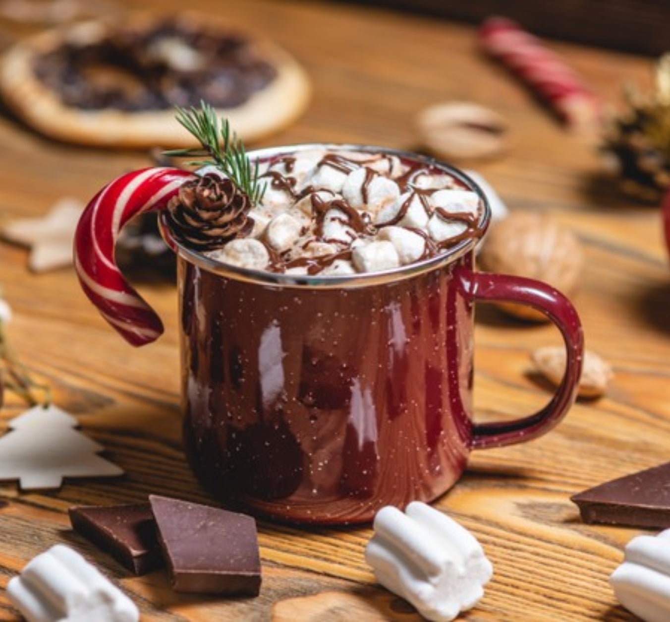 powdered baking chocolate, creamy milk, sugar, vanilla, and candy cane.